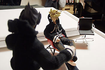 尺寸が微妙に合わないので、ガキの椅子をオッサンが取り上げて座ったように見える。