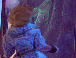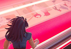 ショーウインドウに部屋の中央のホログラフが移り込んでいる。