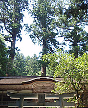 神社の後ろには三本の杉の巨木が聳えており、