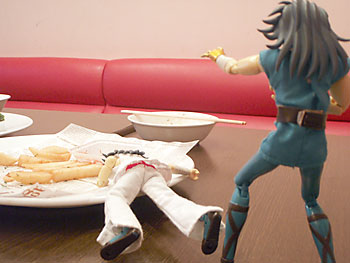 唐揚げ最後の一個にありつく東のカノンとそれを狙う西のカノン。