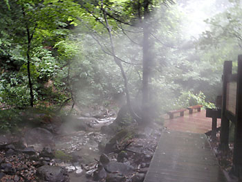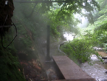 あちこちに源泉が涌いているのか、夏場に拘らずあちこちから湯気が立っている。