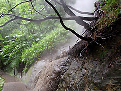 元来た道に大量の熱湯が降り注いでいる。