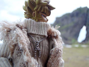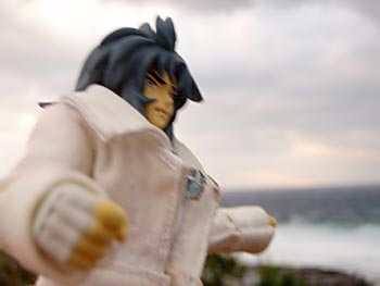 荒れ狂う海をバックに。