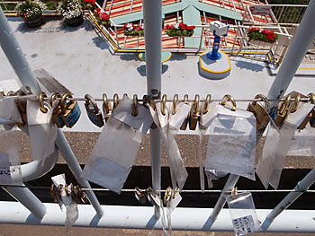 南京錠とそれお願いごとを書いた紙が大量に吊るされていた。