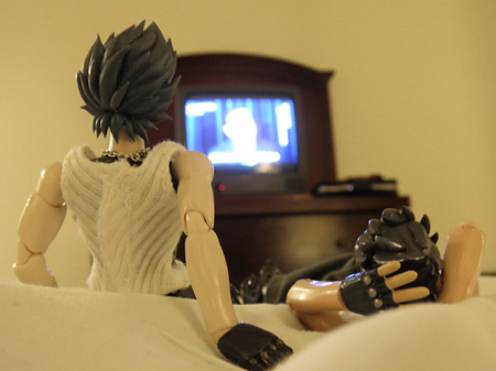 ホテル備え付けのテレビを見る天暴星と天雄星。