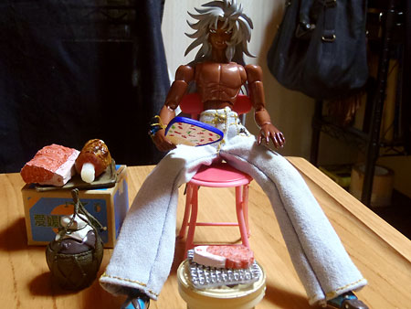 隣には瓶入りの泡盛と肉の塊。どんだけ肉好きなんだこいつ。