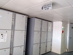 ともあれ、大型荷物専用の棚があったのだが、下の段は争奪戦。棚の上の段は開いているが、頭上に持ち上げる根性もなかったので、隅っこ側に置いて、念のために柱にワイヤーロックを掛けておいた。