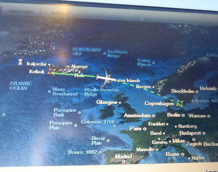 レイキャビク発が7:45分でコペンハーゲン着が12:45分で一見5時間近く飛んでいるように見えるが、時差があるので+2時間となる。