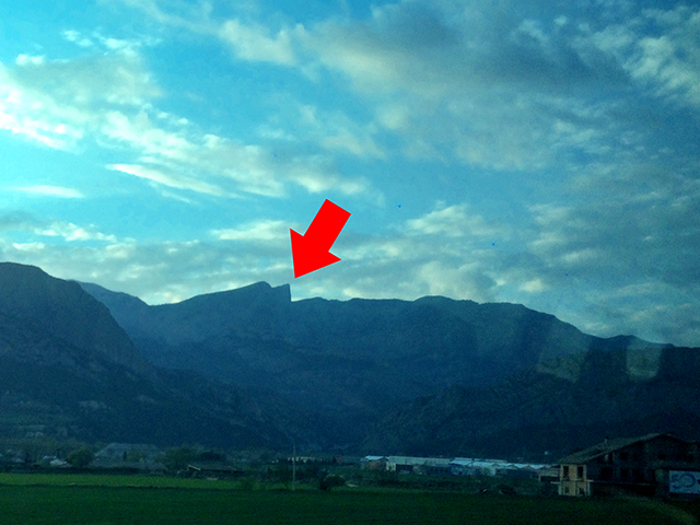 牧歌的風景の背後に何だこりゃな形の山々が見えてくる。