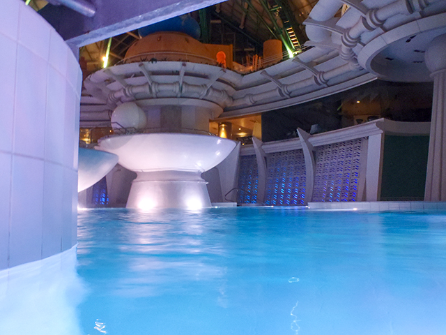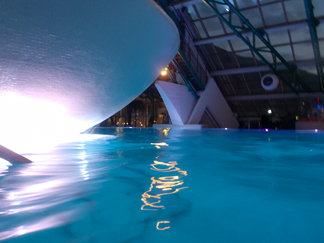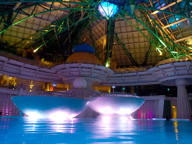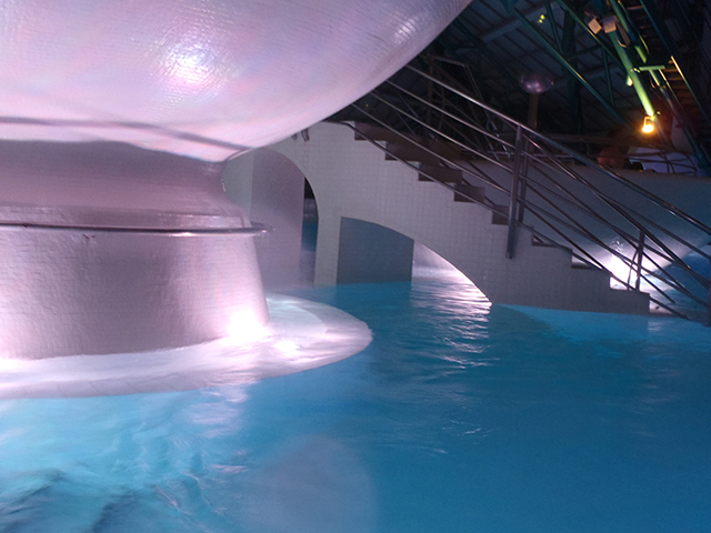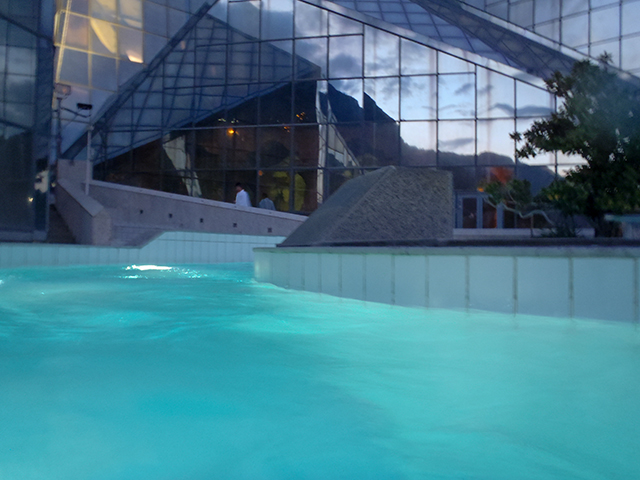 寒いので屋内へ退避。温泉ではなく温水プールなので結構冷えるのだ。