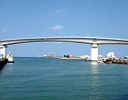 泊港を背に、泊大橋に迫る。