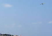 泊港の左手には那覇空港があり、離陸する飛行機を見ることが出来る。