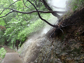 元来た道に大量の熱湯が降り注いでいる。