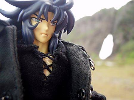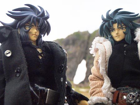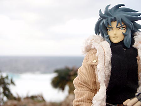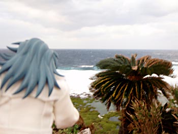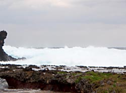 荒れ狂う海をバックに。