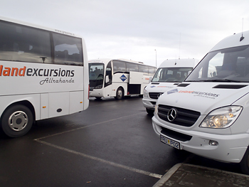 本日催行のツアーバスが一杯。同じ名前のツアーでも、間違えて乗り込みかけると『お前の乗るバスではない!』とやられる。