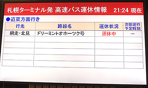 台風の影響なのか網走行きのバスは運休となっていた…。