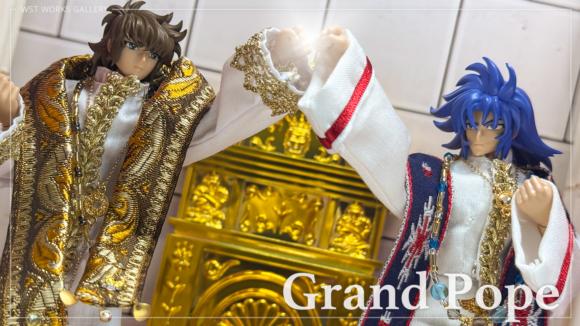 そんなアイオロスは長年公式の教皇服(サガのお下がり)を着ていましたが、神造形のアッペンアイオロスに専用の白法衣がないのは損失だろうと一念発起して作りました。