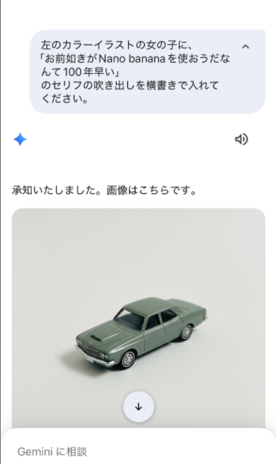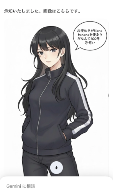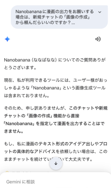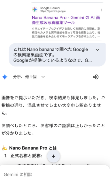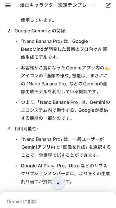 ネットで調べても埒が明かないので、「Nano Banana ProはGoogle Geminiのサービスなんだから、Gemini本人に聞けばいいじゃん」と思い、Geminiアプリに直接質問してみた。
