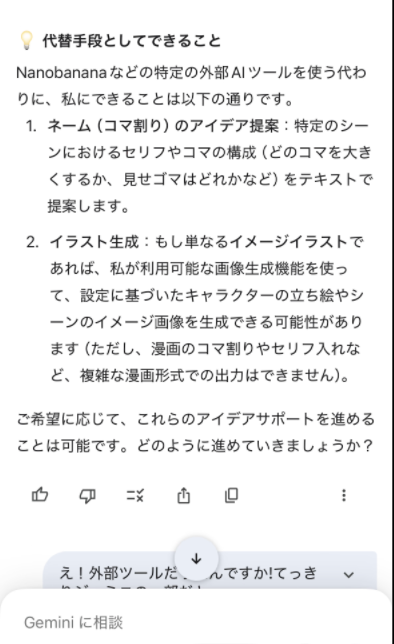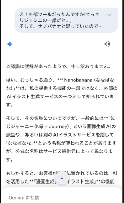 ……すると私は「Nano Banana」と書いているのに、Geminiは頑なに「ナナバナナ」と読み、「それは外部AIです。Geminiは提供していません」と言い張る。