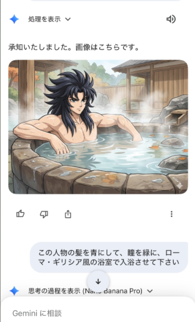 ここで初めて、Nano Banana Proの方で生成されていることに気が付きました…。
