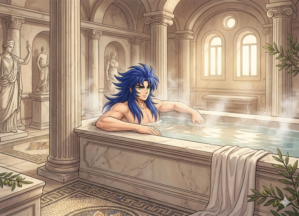 「この人物の髪を青にして、瞳を緑に、ローマ・ギリシア風の浴室で入浴させて下さい」の指示を出したらイメージに近くなるのでは?と思い、再度指示を試みた。